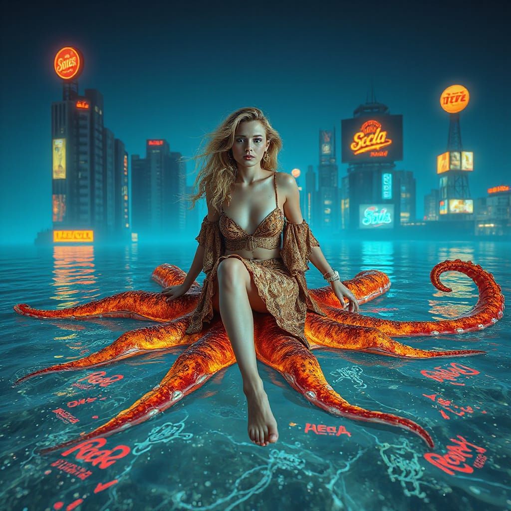 This image features a luminous woman with golden hair and blue eyes, wearing glowing bohemian attire. She sits on a colossal squid adorned with graffiti, set against a surreal cityscape and a sparkling soda ocean.