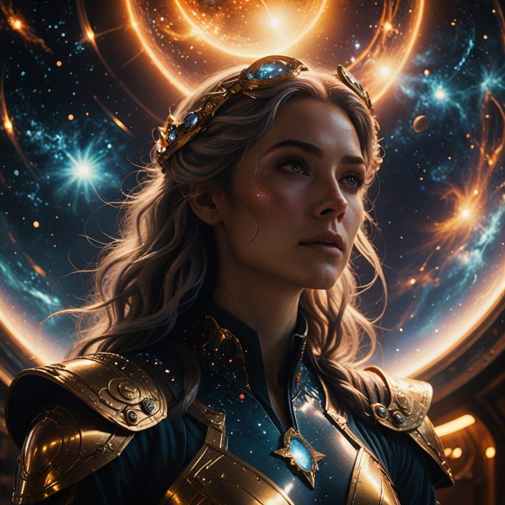 A captivating, hyper-realistic portrait of a mystical sorceress surrounded by swirling galaxies and stardust, set against a soft, ethereal glow of nebulae, evoking a sense of cosmic wonder and enchantment.