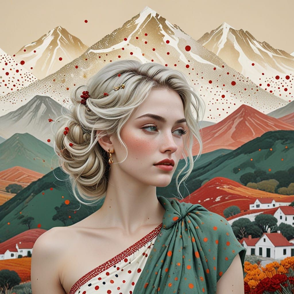 A surreal image of a doorway symbolizing womanhood, rendered with rich emerald green and vintage polka dots. The landscape includes hills subtly shaped like matriarchal figures in muted tones.