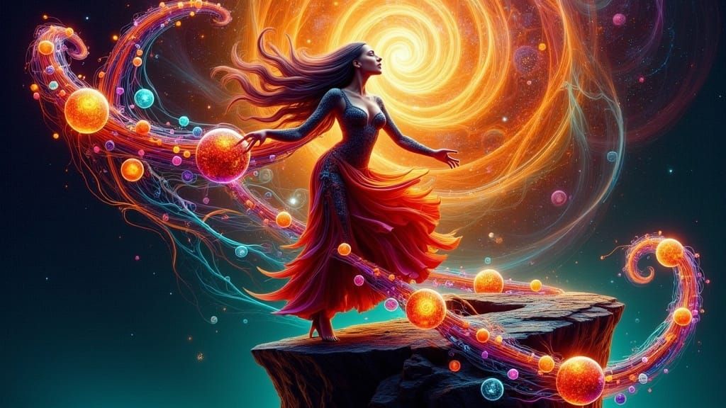 A surreal image shows a flamenco dancer in a red dress at the edge of a cliff overlooking a star-filled abyss. Glass spheres line the cliff, with a cosmic vortex above, rendered as digital art.