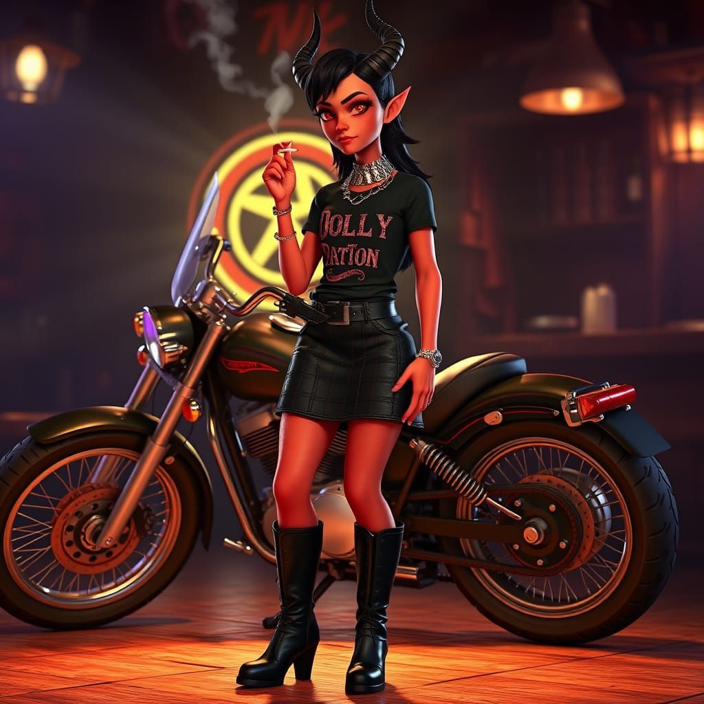 This image shows a red-skinned demon in punk attire smoking a cigarette next to a motorcycle. This Pixar-inspired 3D rendering features cinematic lighting, hyper-realistic textures, and a vibrant background.
