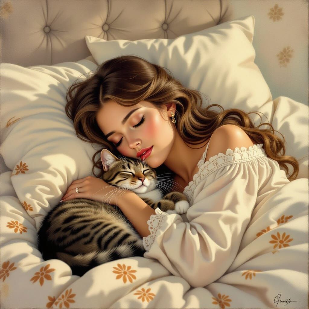 A grayscale, hyperrealistic drawing of a young woman and a cat nestled together in a bed. The woman sleeps peacefully with her eyes closed, embraced by the cat, which is also asleep. The woman’s long hair falls around her shoulders in loose waves, and her face displays a tranquil expression. The setting ...
