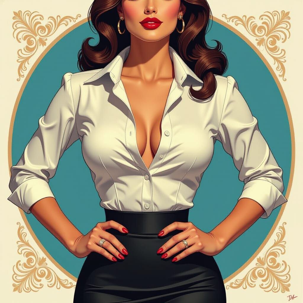 This image features a confident, sensual woman with an athletic physique, wearing a tight blouse, pencil skirt, and stockings. The art style combines bold lines, vibrant colors, and sensual curves.