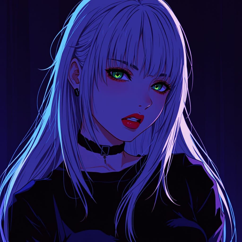 This image shows a cyberpunk anime-style woman with long white and pink hair and green eyes. The character is bathed in dark light, with a blue-purple-black color palette, creating a mysterious and captivating punk rock aesthetic.
