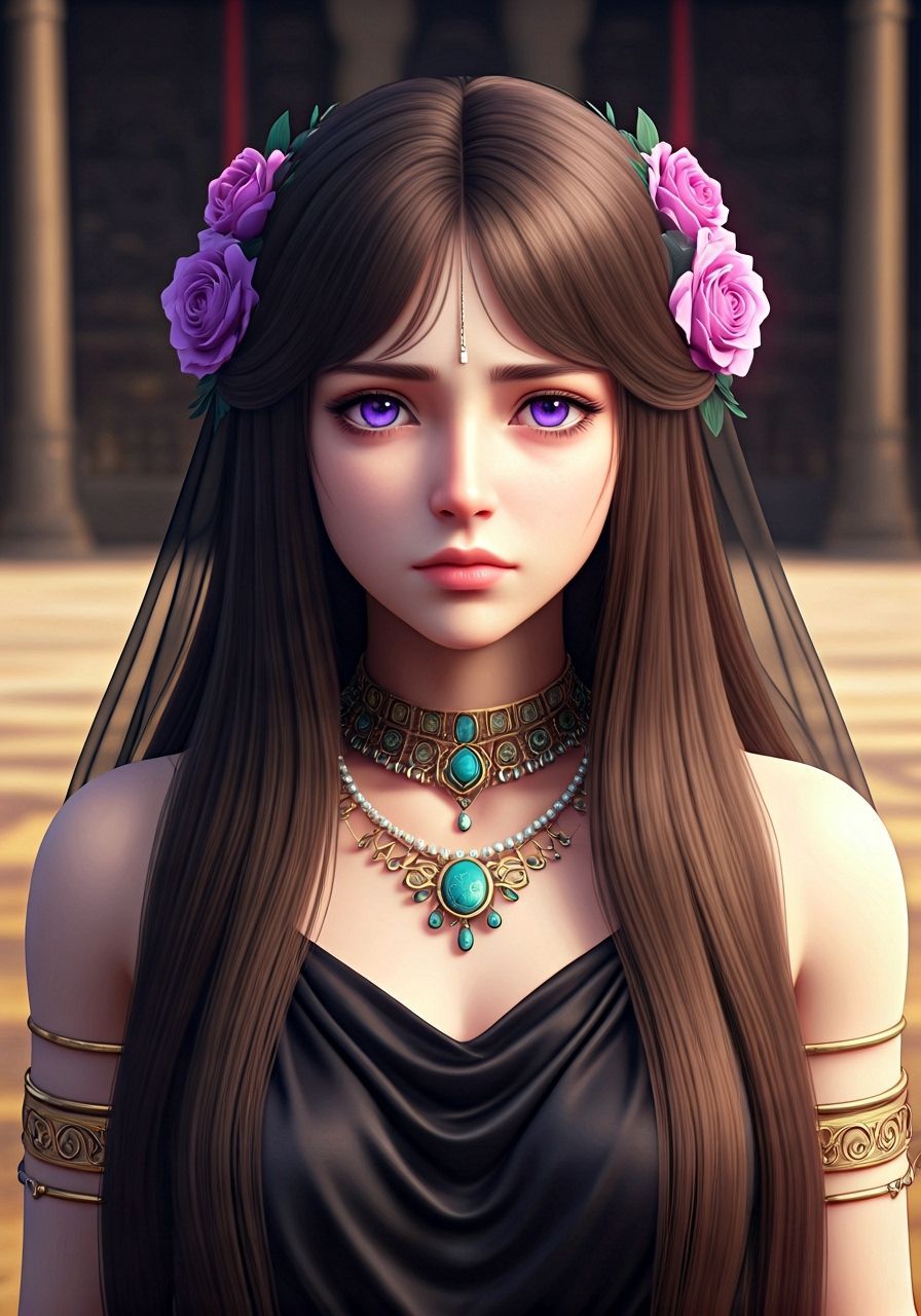 This 3D anime-style artwork depicts a detailed ancient Greek woman with sad eyes, dressed in a black silk chiton and veil, adorned with jewelry, as she walks within a palace arena.