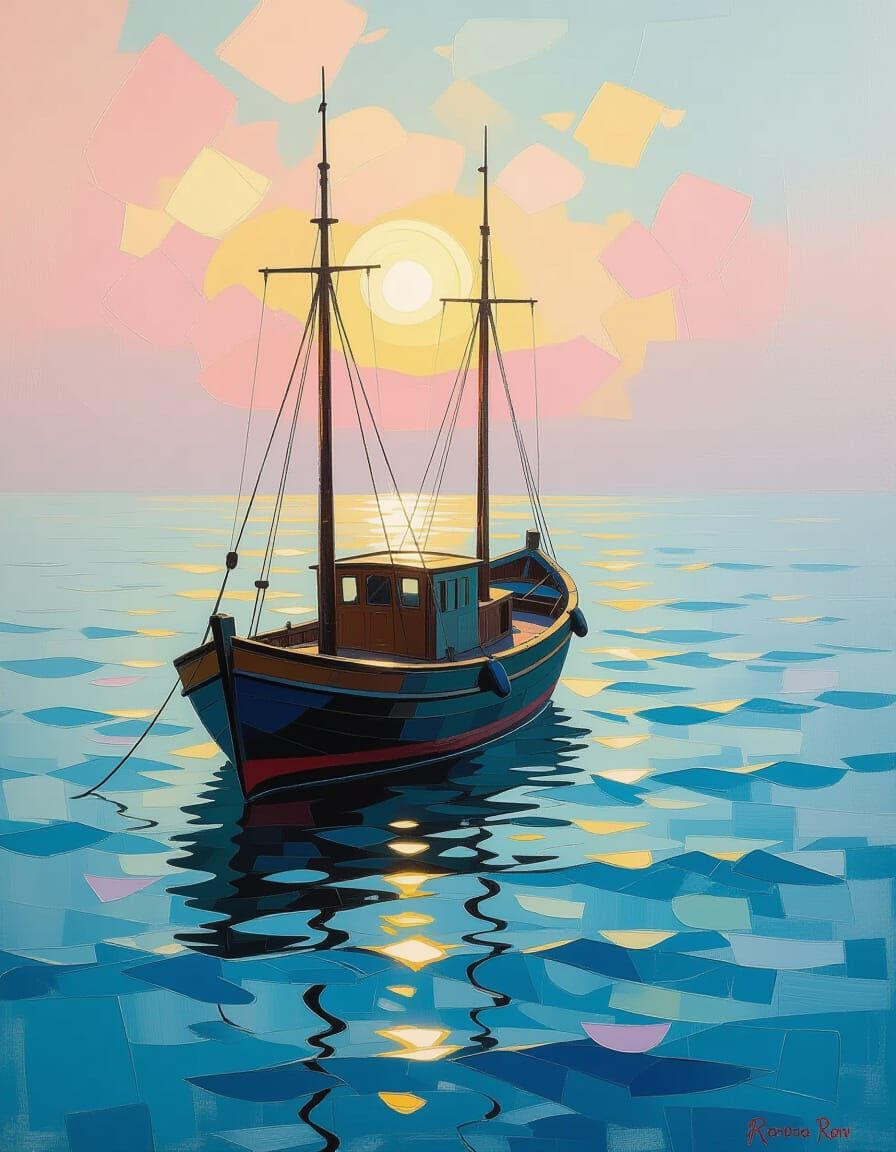 A bird's-eye view of a shipwreck gently swaying in the sea. The image is a modern impressionistic painting with radiant pinks, cool blues, and shimmering gold accents, creating a dreamlike and luminous aesthetic.