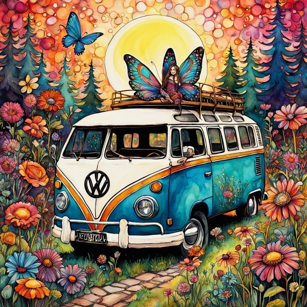 This image shows Janis Joplin as a whimsical fairy in a vibrant, colorful garden. An abandoned 1970s VW bus is parked nearby, with glowing flowers and Grateful Dead inspired patterns, rendered in a flowing, watercolor gauche illustration style.