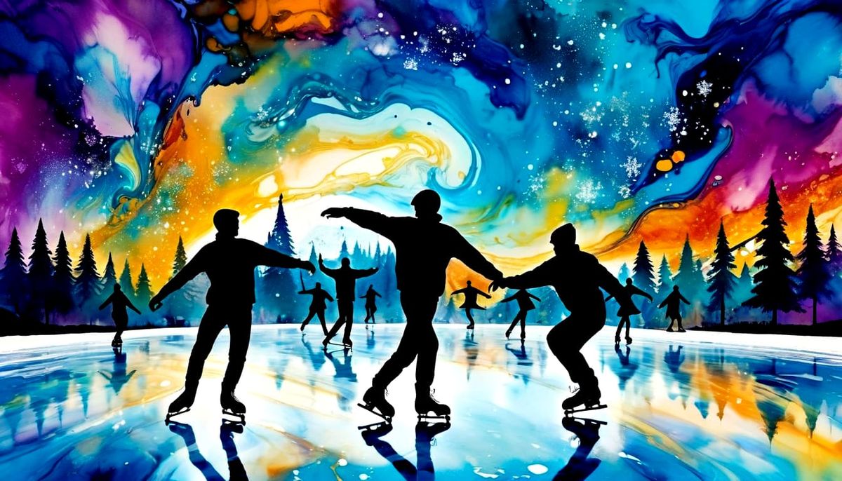 This image shows ice skaters in a fluid, marbled style with radiant and dreamlike spectral colors, evoking an ethereal atmosphere.