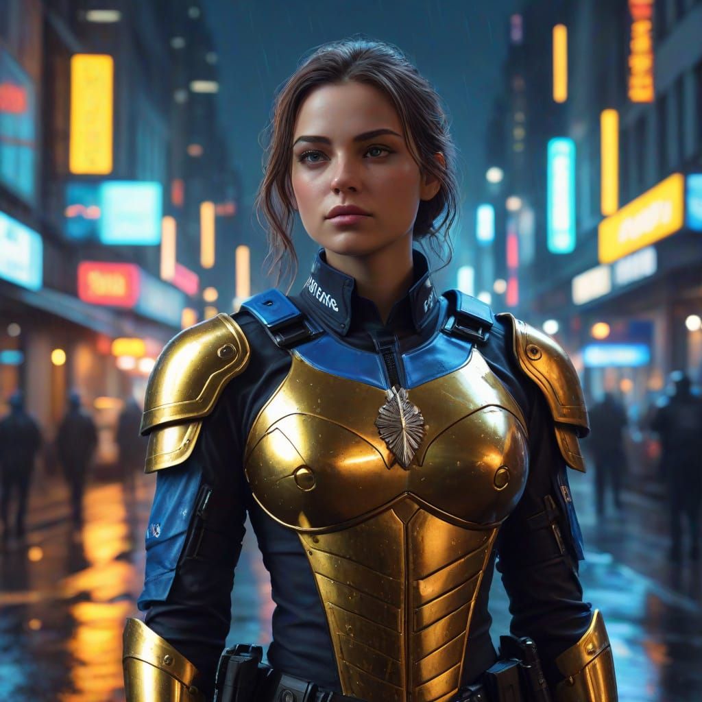 This AI-generated fantasy concept art features a police woman in golden armor against a neon-lit city. The vibrant oil painting style uses dynamic lighting and reflections on wet pavement.