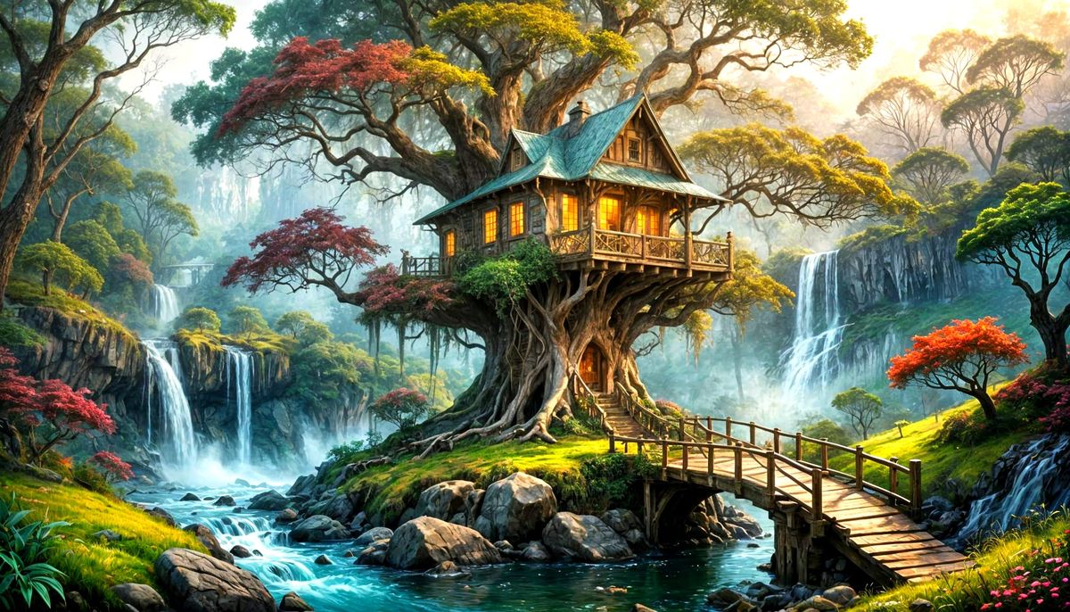 Create your own enchanting village treehouse images with our free AI image generator, featuring soft pastel colors and cozy atmosphere