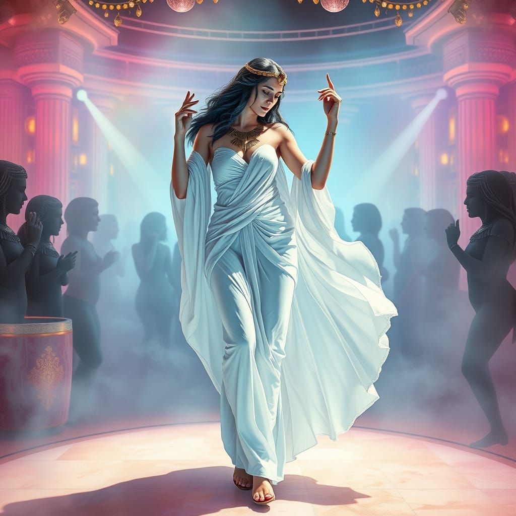 This image shows Aphrodite in flowing robes dancing in a disco. The artwork blends Botticelli-inspired elements with Egyptian themes, using soft pastel watercolors in monochrome tones, creating a vibrant, high-resolution cosmic illustration.