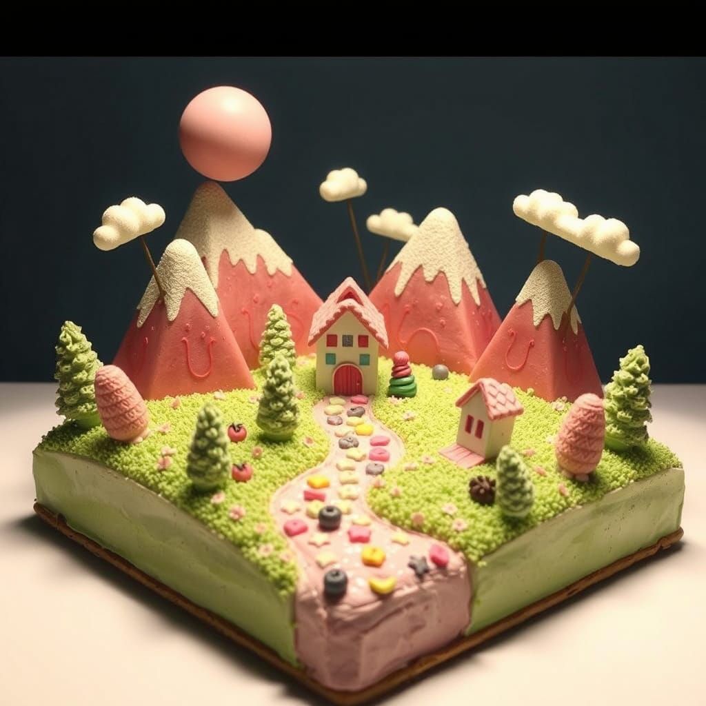 This image shows a fantastical landscape made entirely of desserts. It features hills of cake, rivers of chocolate, and trees of candy, creating a whimsical scene.