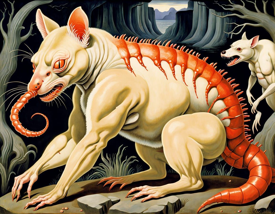 This image shows a grotesque, surreal fusion of human and animal body parts, with a dark, gritty aesthetic reminiscent of cyberpunk art. Vivid colors and disturbing details illustrate a nightmarish scene of surgical horror.