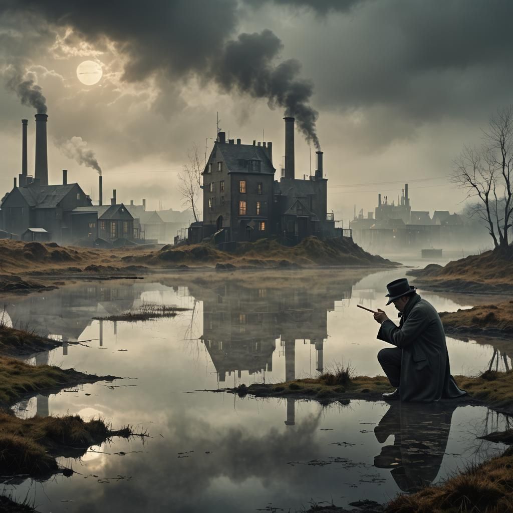 This image shows a man in a trenchcoat and hat kneeling in a foggy moor, examining something with a magnifying glass. The scene is set against an industrial city under a bleak sky, in a cinematic digital painting style.