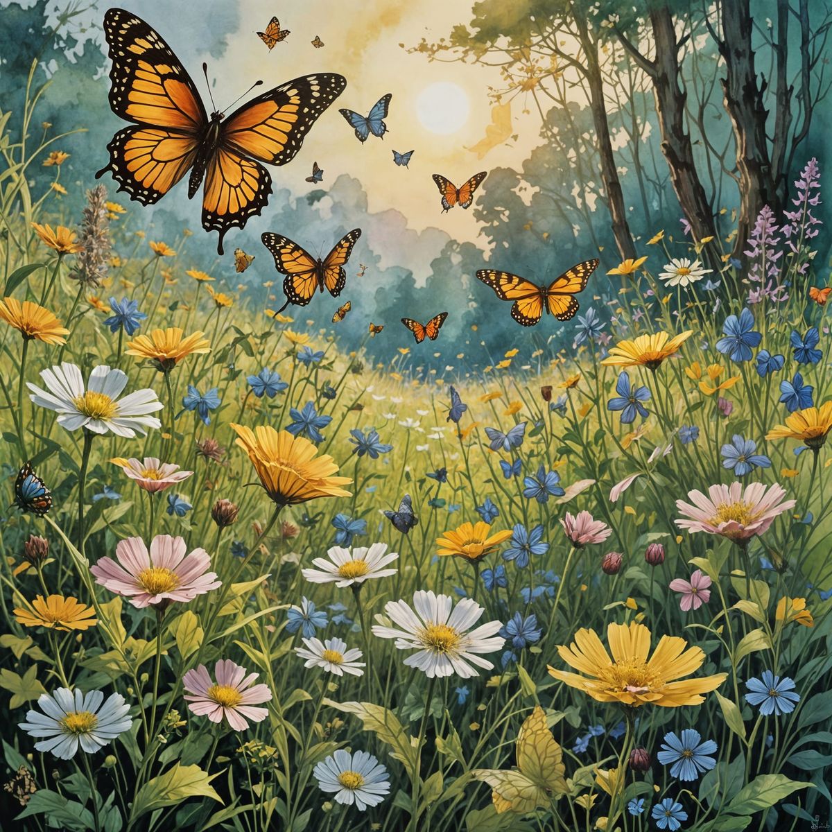 This vibrant watercolor painting captures a joyful Earth Day celebration in a lush meadow, with butterflies, bees, and blossoms dancing in a sun-kissed scene, rendered with delicate washes and loose brushstrokes, symbolizing nature's magic and whimsy.