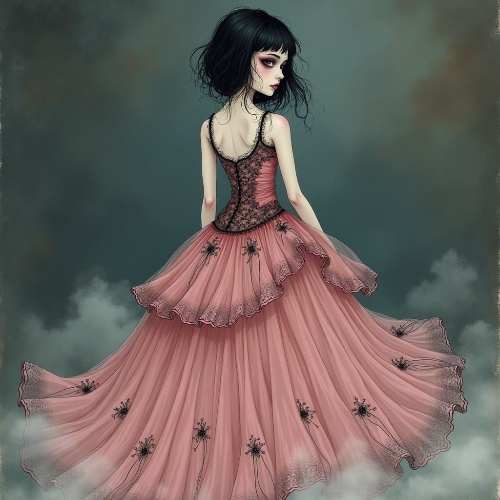 A gothic girl with pale skin and dark makeup is dressed in a flowing pink Victorian gown. The image evokes a dark, mystical aesthetic with dreamy watercolor elements and bold comic art lines.