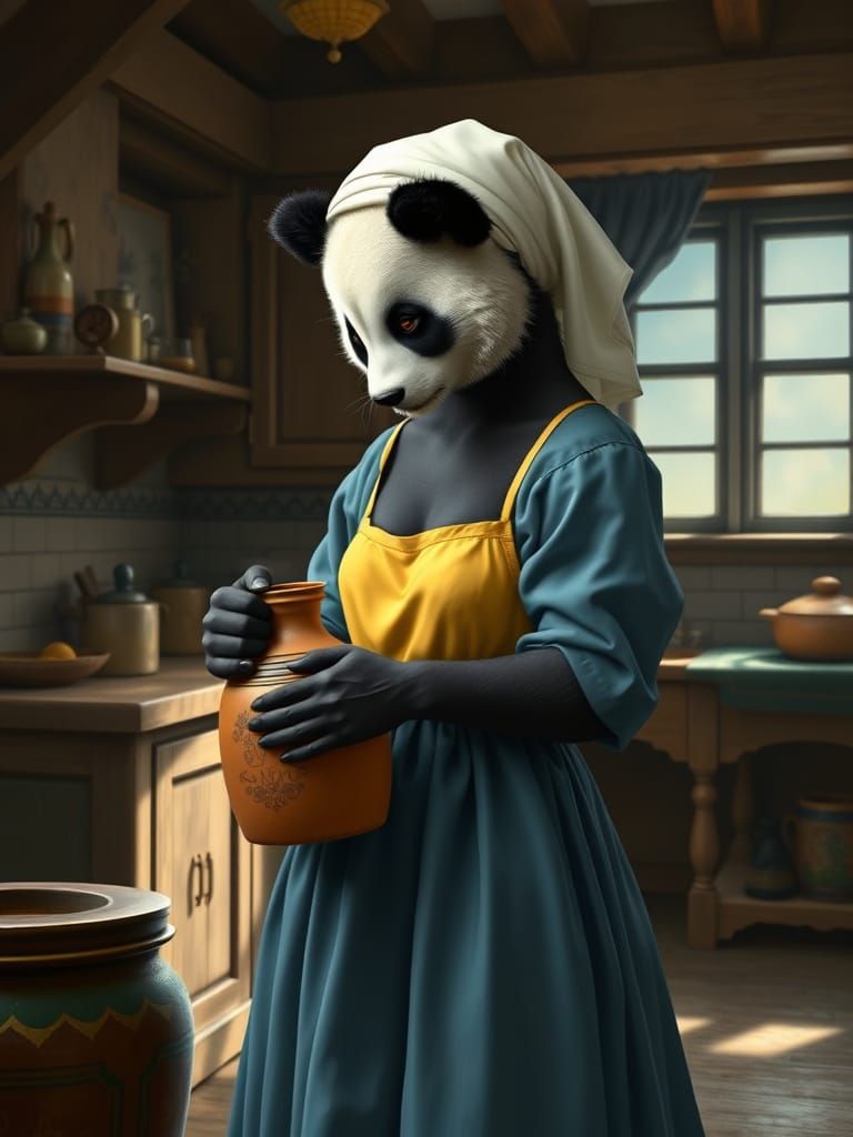 This image shows a tranquil anthropomorphic panda in a 17th-century Dutch kitchen setting, inspired by Vermeer's masterful light and composition, with subtle hints of chiaroscuro and sfumato, blending Dutch Realism with modern digital art