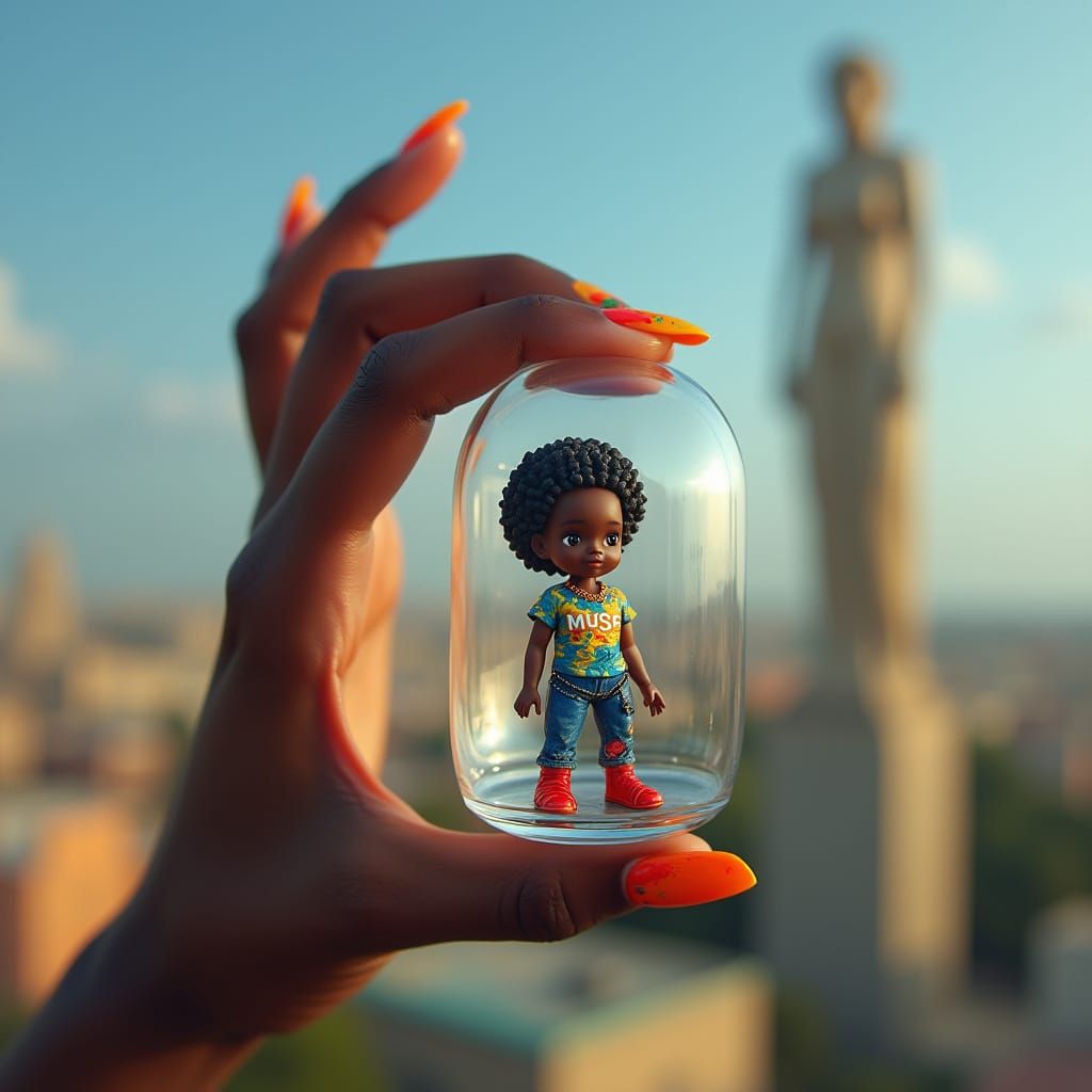 This image shows a black woman cradling a stunning, all-glass collectible capsule in her fingers, showcasing intricate details and vibrant colors. The scene is set against a soft, blurred background of Dakar, Senegal, with the African Renaissance Monument rising in the distance.