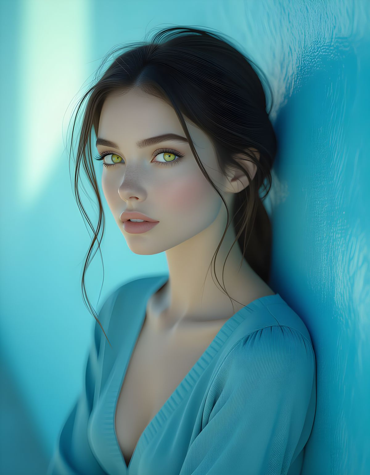 A photorealistic image of a woman with pale bluish skin and yellow eyes. The portrait captures intricate details with dramatic lighting against a colorful background.