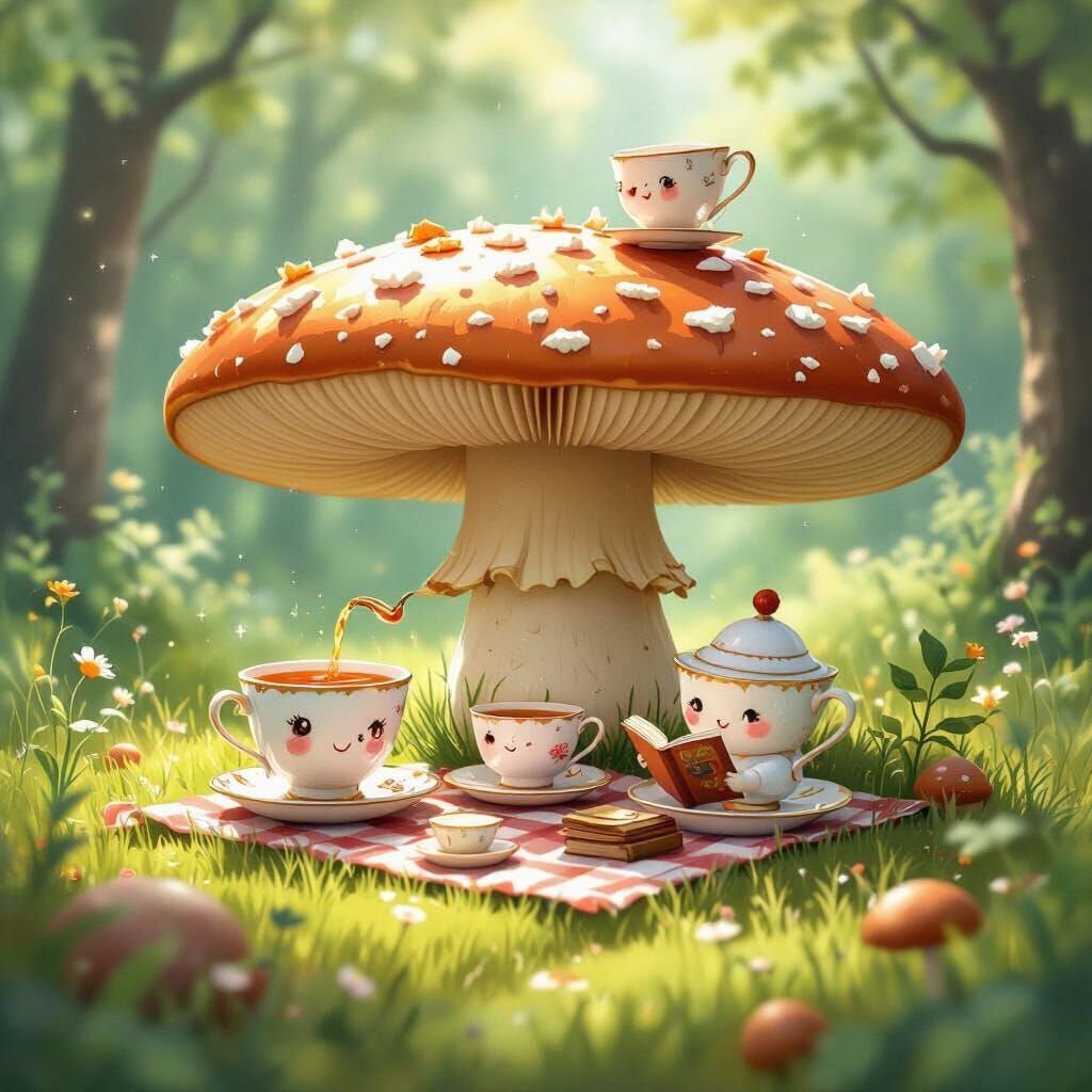 This image shows tiny, anthropomorphic teacups enjoying a picnic on a large mushroom in a forest clearing. Rendered in a soft, painterly style reminiscent of vintage storybooks.