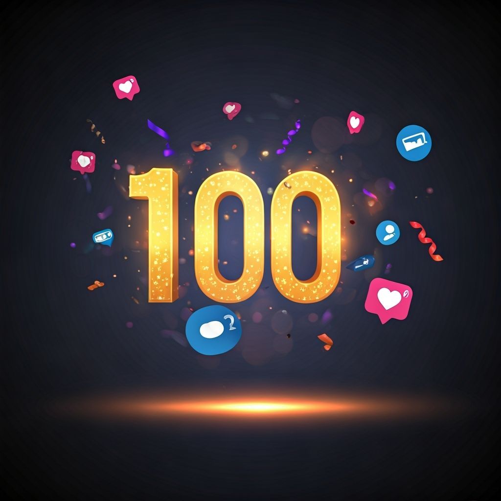 This image shows a digital social media milestone celebration, with the number 100 displayed prominently. Animated confetti, colorful lights, and follower icons create an energetic and exciting atmosphere with bokeh lighting.