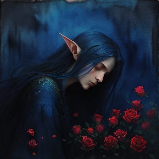 This image shows a young elf in deep thought, surrounded by swirling rose petals. The watercolor style features smudge grunge texture and deep, moody colors.