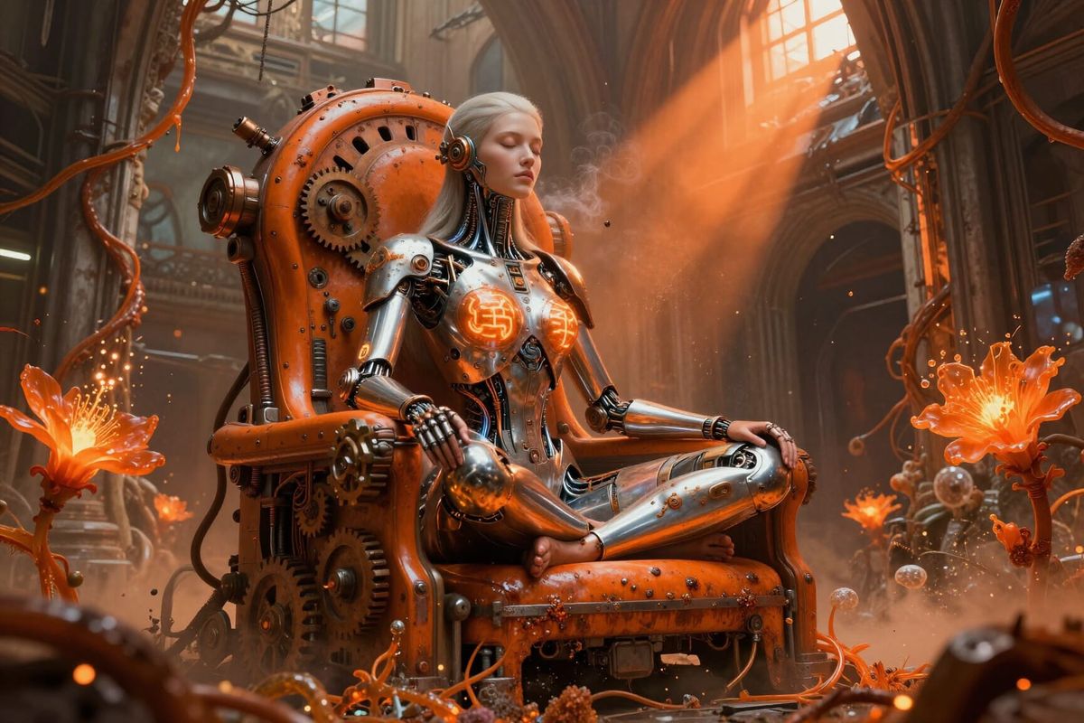 A hyper-detailed digital painting of a meditating female cyborg on a colossal orange throne in a derelict industrial hall overgrown with bioluminescent vines and fiery blossoms. Dramatic orange lighting.