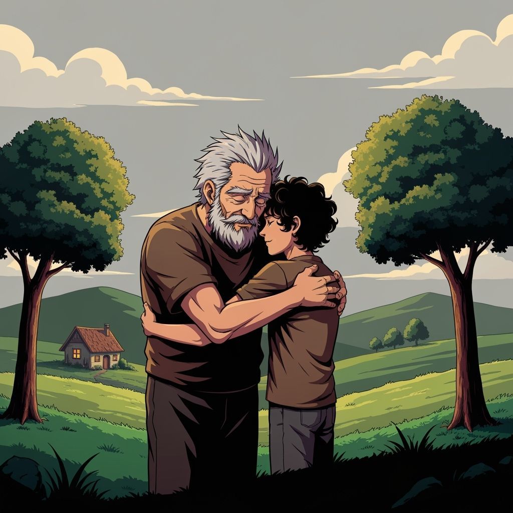 A heartwarming image of an elderly man with a beard embracing a younger man with curly hair. The scene features peaceful trees, a cozy home, and green hills under a soft sky, depicted in a vibrant, cel-shaded style.
