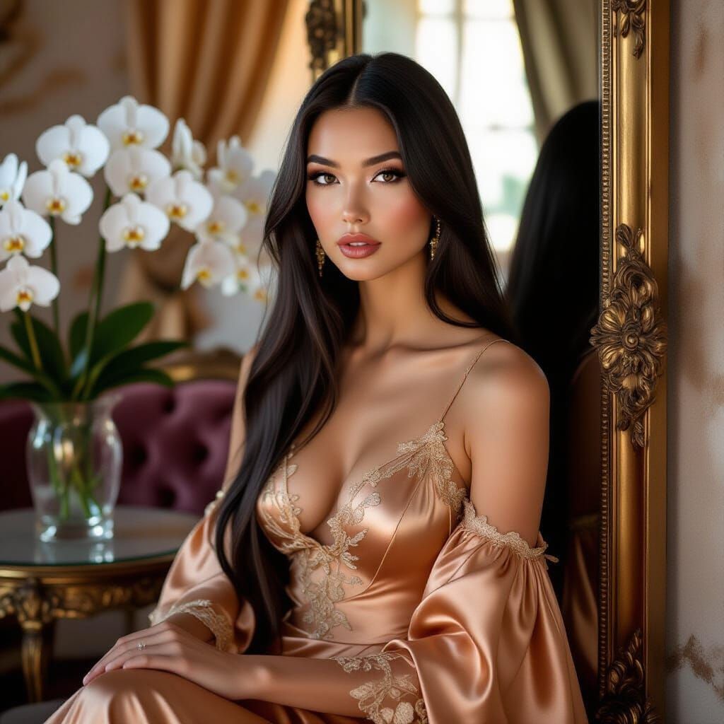 A photograph of a young woman with long, straight raven black hair and porcelain skin, elegantly posed against a softly lit antique mirror. She is adorned in a flowing oro satin dress featuring intricate gold embroidery along the neckline and cuffs, her expression conveying quiet confidence with subtle ...