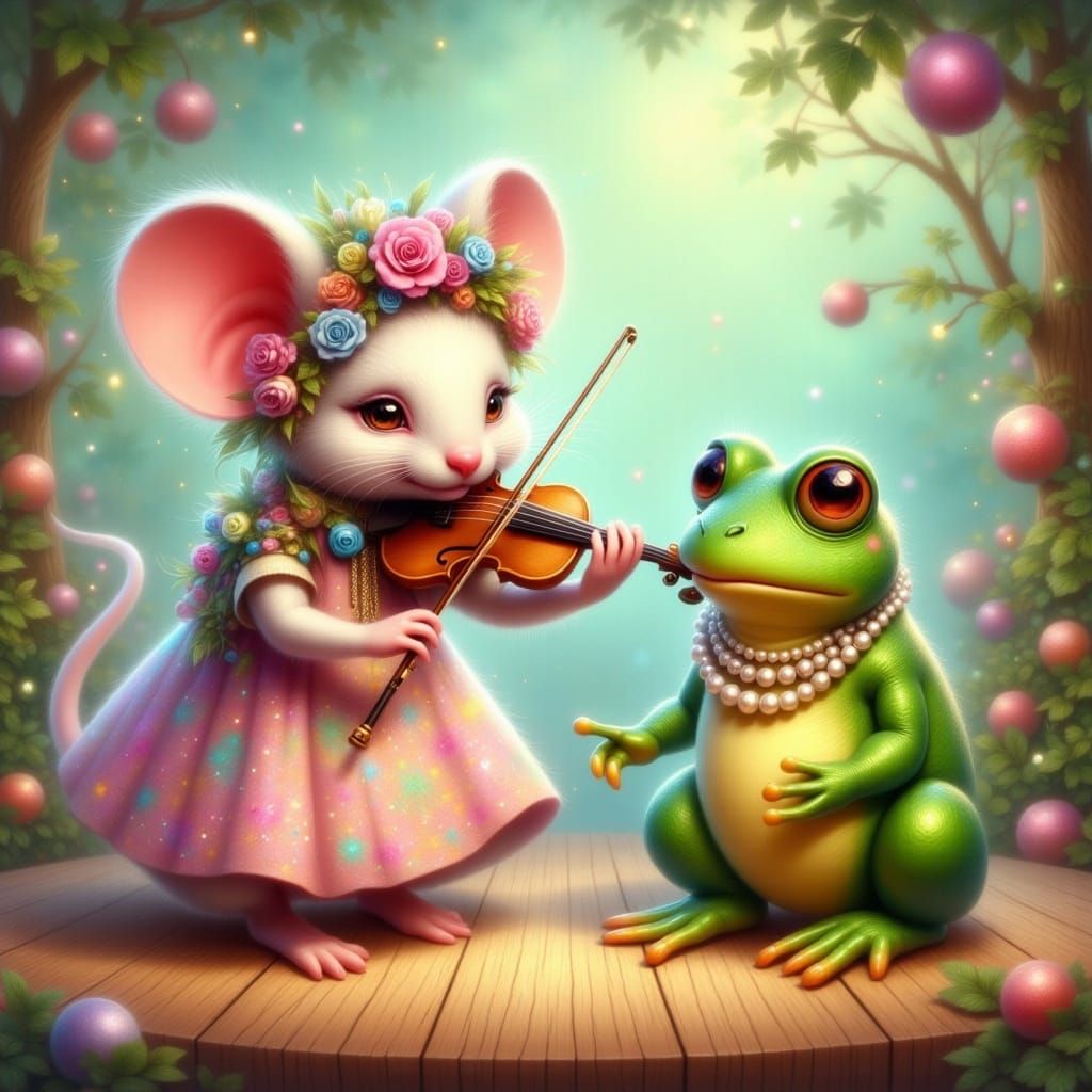 This image shows an endearing scene of a mouse in a dress playing violin for a frog with a pearl necklace on a stage. The digital painting features vibrant colors, soft lighting, and a whimsical, fairytale atmosphere.