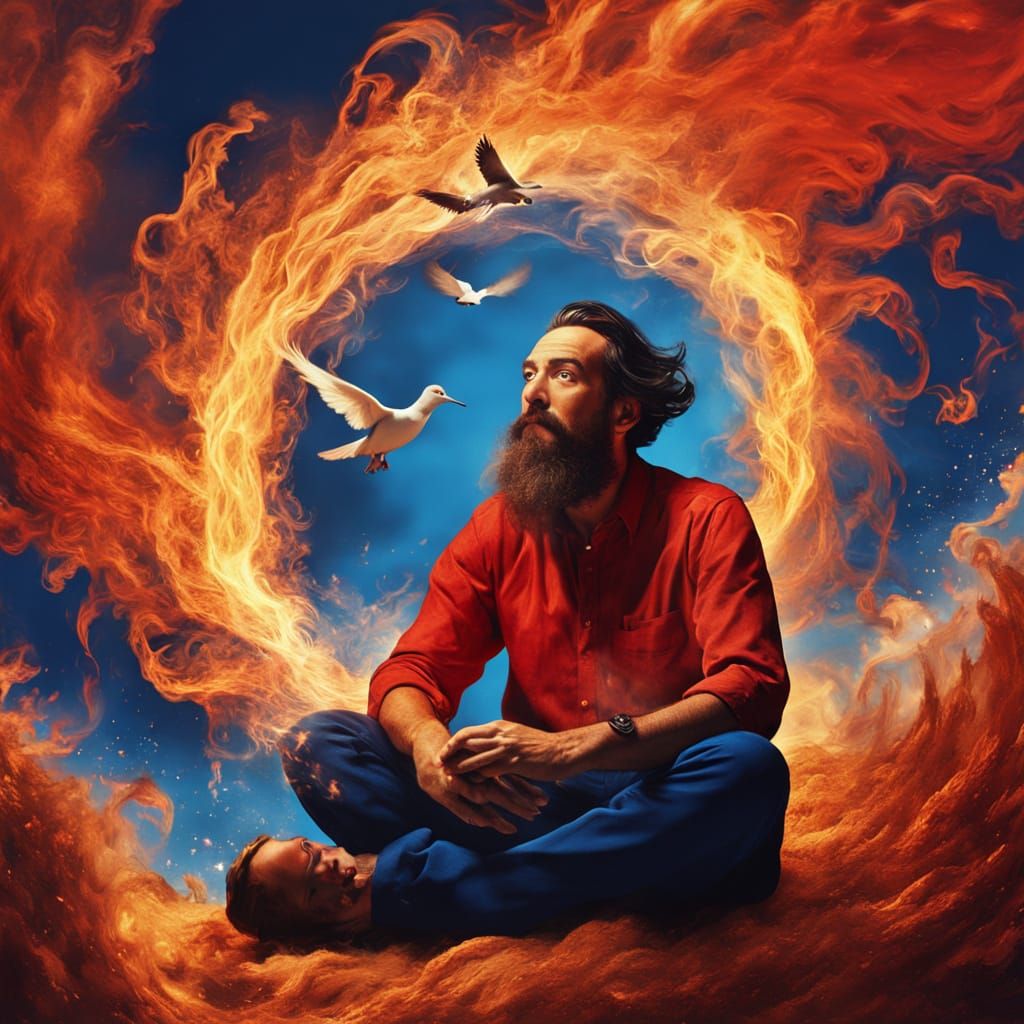 A surreal image of a bearded man in red linen sitting in Harvard Square. The dreamlike portrait features a blue flame, golden tornado, vibrant colors and dynamic lighting, in a Salvador Dali aesthetic.