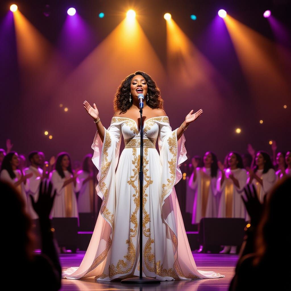 This ultra-realistic image shows a passionate female gospel singer in a white gown with gold embroidery, performing on a grand stage with dramatic lighting. A gospel band and choir support her soulful worship.