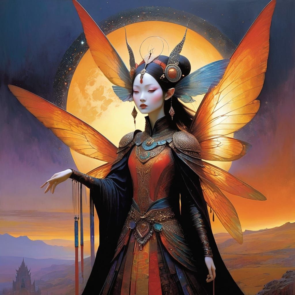 A vibrant and colorful portrait of a whimsical fairy character in a mixed media style. The art features rich sunset colors and otherworldly elements.