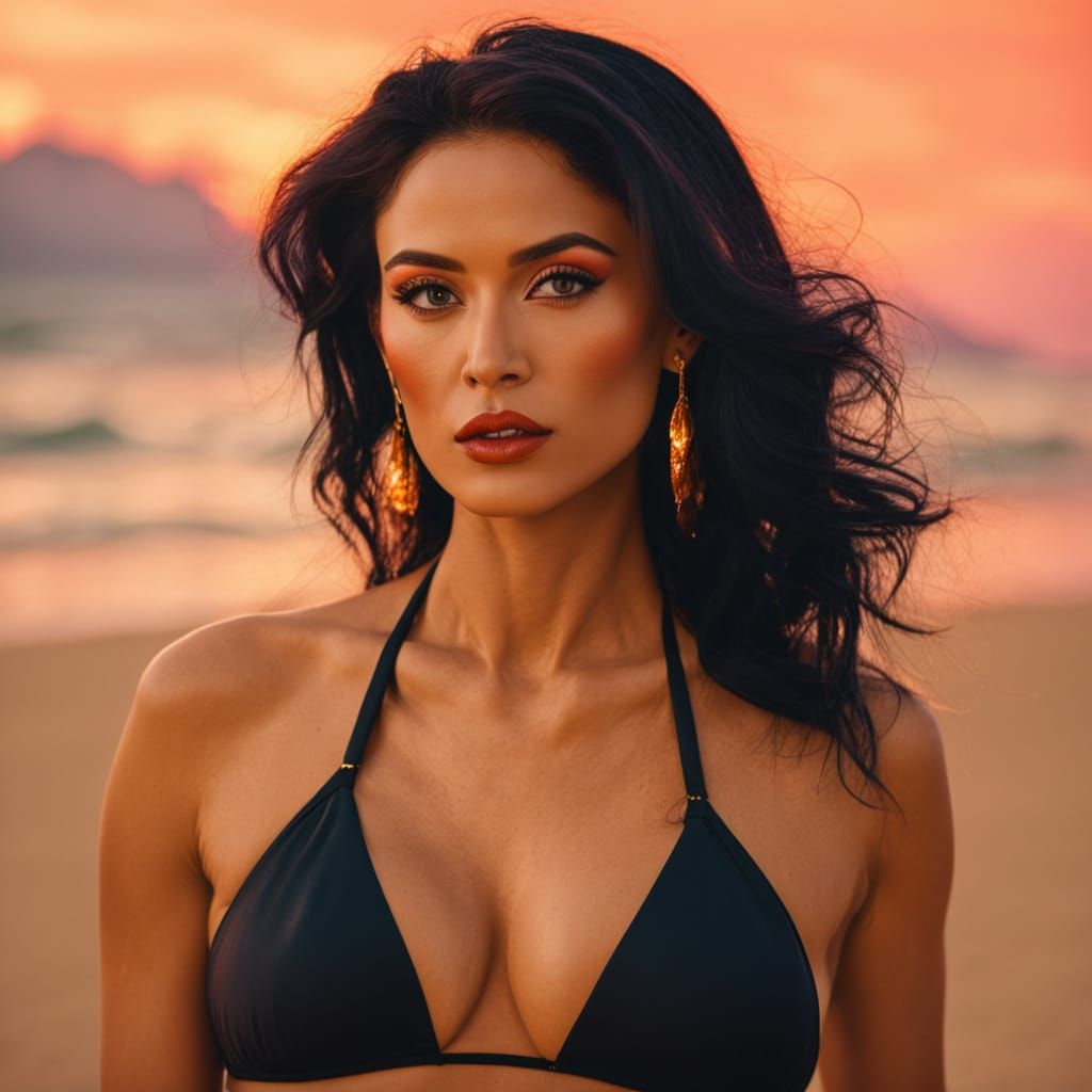 A striking picture of an exotic woman on a golden beach in a retrofuturist atompunk aesthetic. The cinematic shot features golden light, vibrant colors, and soft shadows, emphasizing her soulful expression.