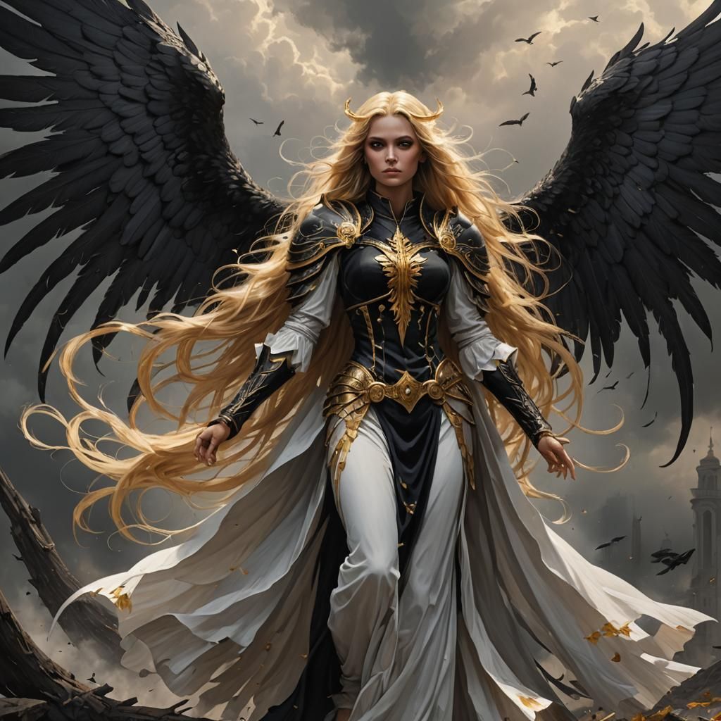 This image shows a fallen Aasimar angel with large black wings and long flowing golden hair. She has golden and black eyes and is presented in a sinister style.