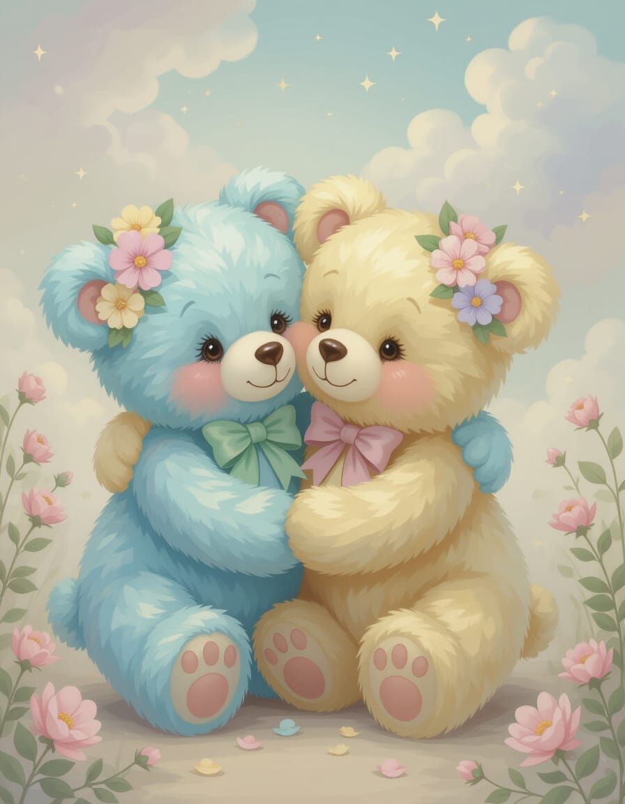 This image shows two cheerful teddy bears, one pastel blue and one pastel green, hugging tenderly. Adorned with flowers and bows, they are depicted in a realistic acrylic and olive paint style with pencil detailing, set against a dreamy, muted background.