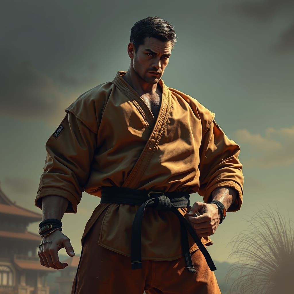 This image shows a muscular blond man in a karate pose, wearing a martial arts uniform. It has a realistic style with detailed textures and deep shadows.