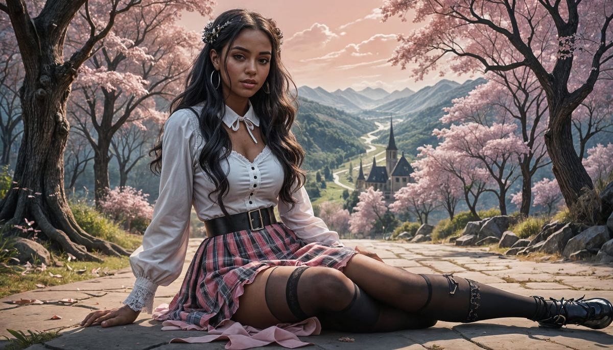 A stunning 22-year-old Dominican woman with athletic build and long black hair, smiling. She wears a white blouse, tartan skirt, and gothic stockings, seated in an amazing scene.