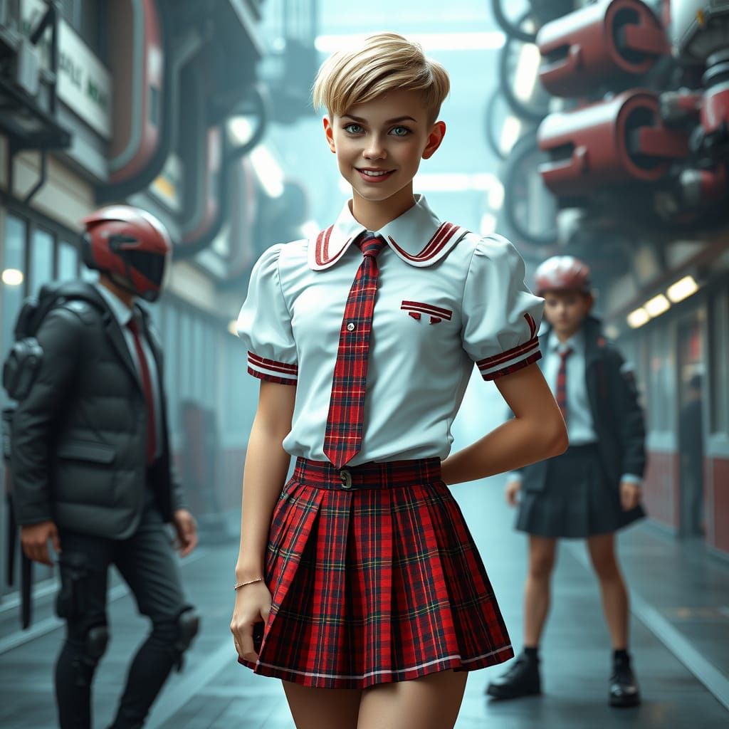 A young man poses in a modernized schoolgirl uniform, featuring intricate details and a polished, high-gloss aesthetic, evoking a sense of sci-fi futurism and cinematic drama.