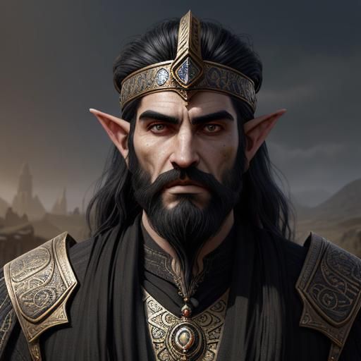 This image shows a portrait of a male Dwemer, a deep elf from the Elder Scrolls universe. He is depicted with swarthy skin, a long beard, and middle-eastern jewelry in a fantasy steampunk style.