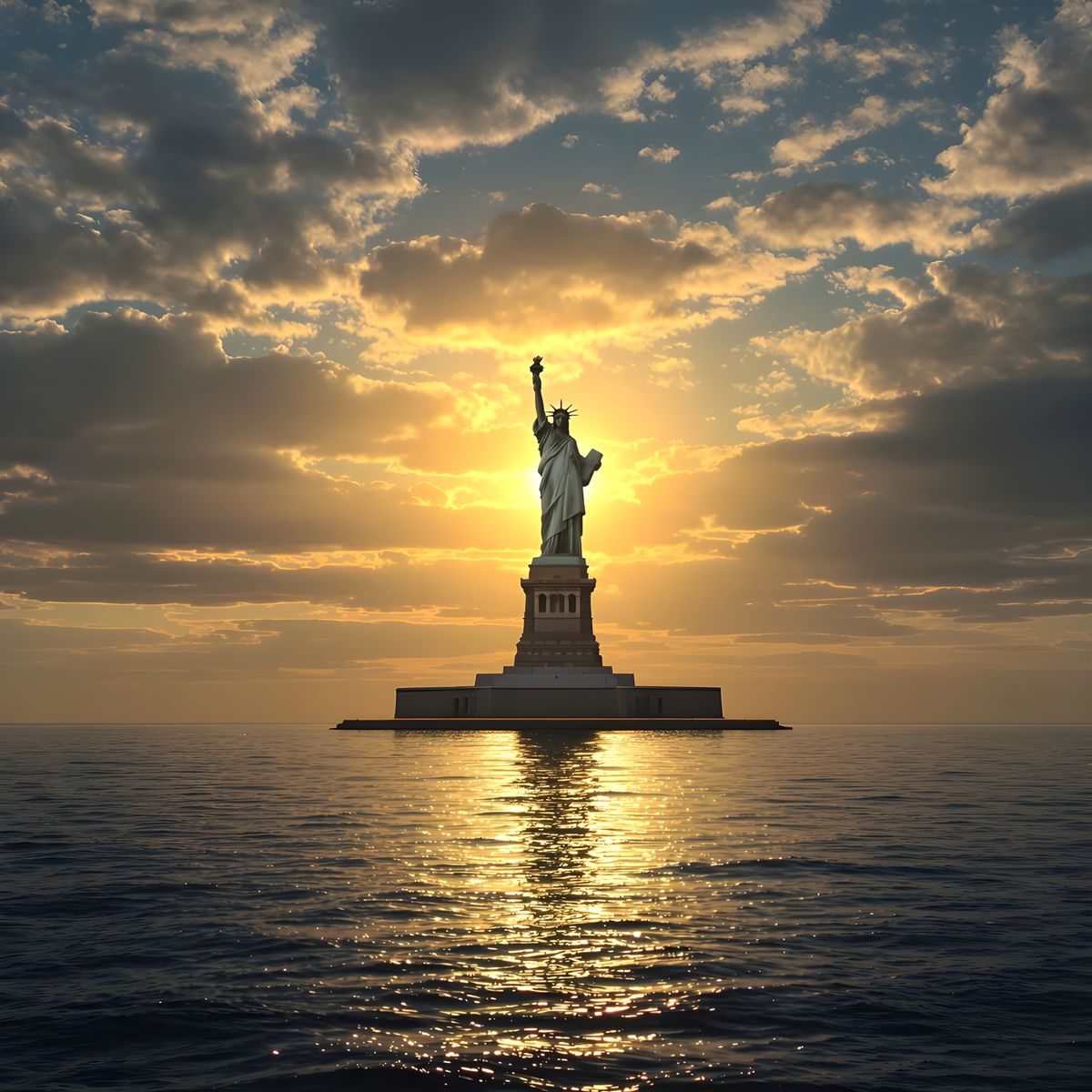 A serene, majestic bronze statue of Liberty stands alone on a placid sea at twilight, bathed in golden light with soft, layered clouds and a reflective ocean surface, evoking a sense of peace and tranquility.