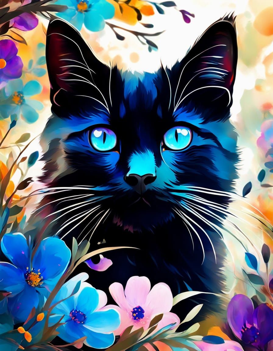 A macro shot of a black cat with blue eyes sitting in a vibrant floral garden. The abstract expressionism piece features soft whiskers, warm sunlight, fine details, and high contrast.
