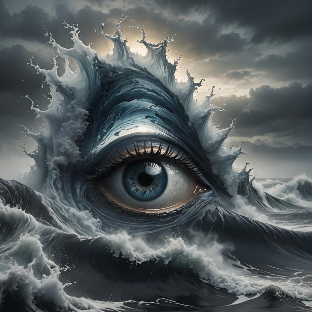 This image shows a transparent glass 'A' shape with intricate eye and brain structures inside. Swirling fog and waves create a dynamic, ethereal backdrop in a bio-mechanical aesthetic.