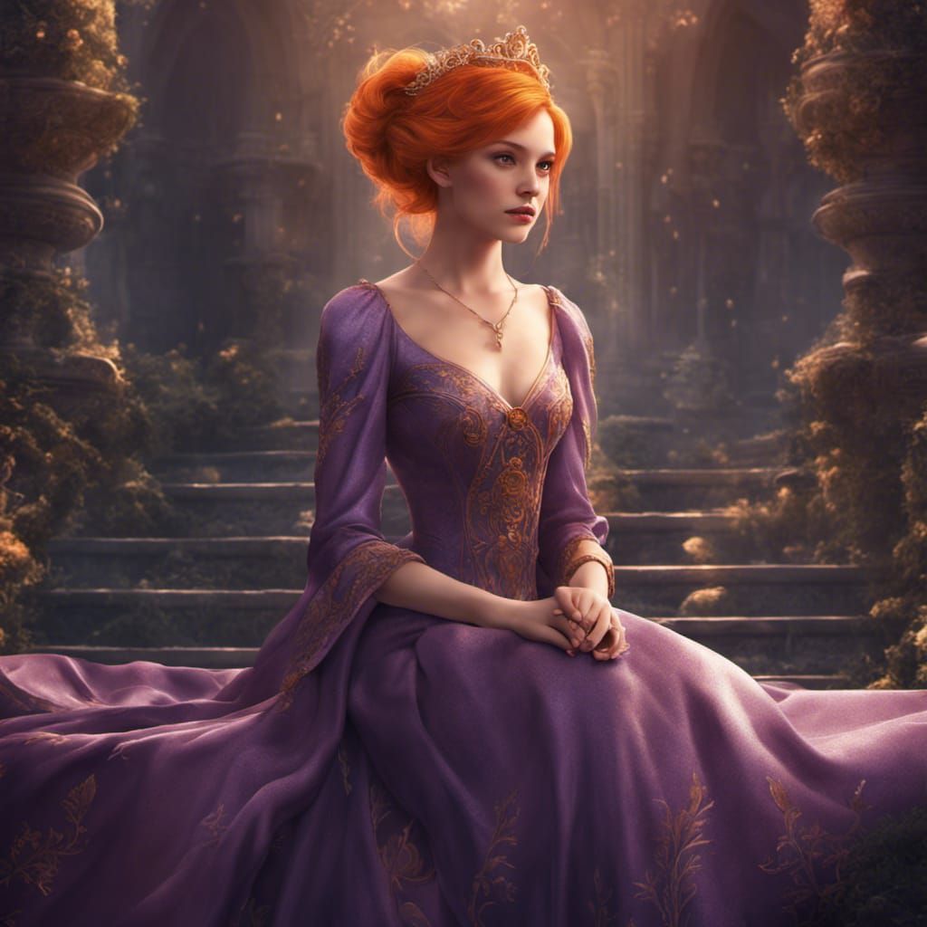 This image shows a beautiful princess with short orange hair and long legs, wearing a purple dress. The artwork features deep colors and intricate details in a fantasy concept art style.