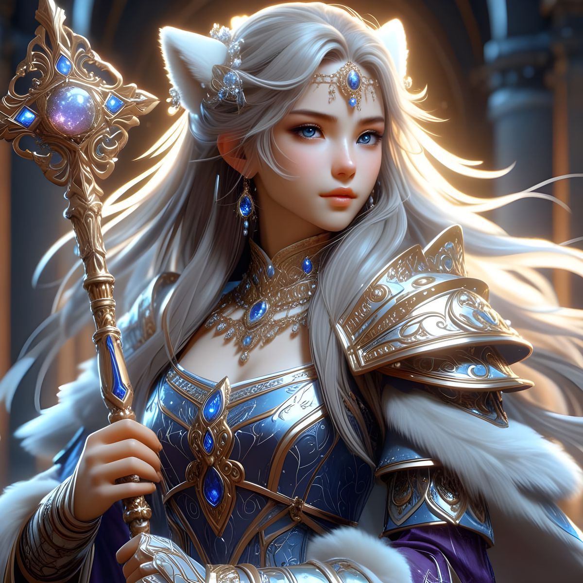 A stunning anime-style goddess priestess with long silver hair and captivating blue eyes, clad in intricate ceremonial armor and holding a divine elemental staff, set against a blurred background with dramatic atmosphere and rich textures.