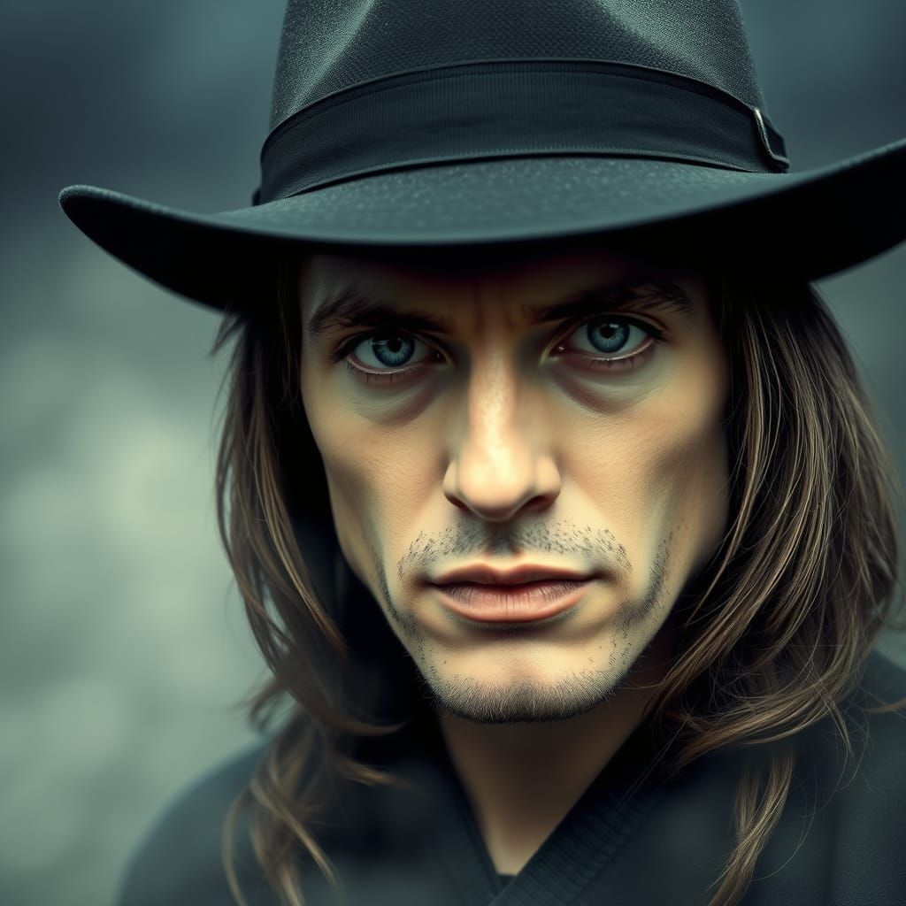 This image shows a poignant digital portrait of a man with a long mullet and black fedora, set against a misty background. His piercing blue eyes convey a sense of sorrow, while his pale skin and muted lips add to the haunting atmosphere.