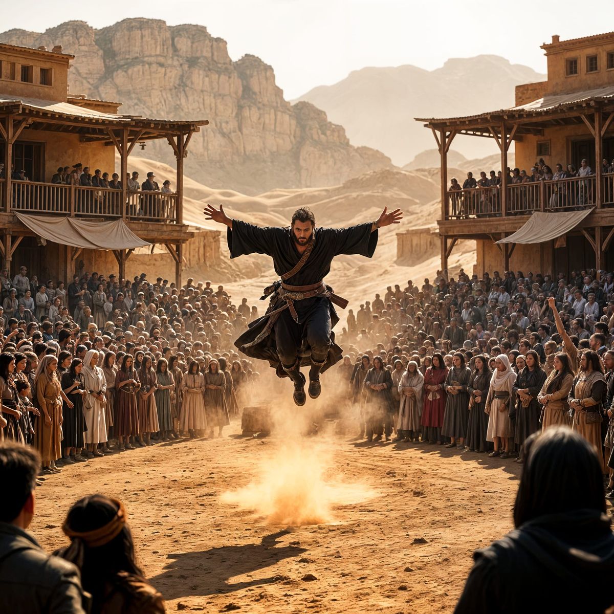 A cinematic film still captures the ragged monk Coleminos soaring above a bustling desert arena. Shot with a film grain aesthetic, featuring dramatic lighting and grading.