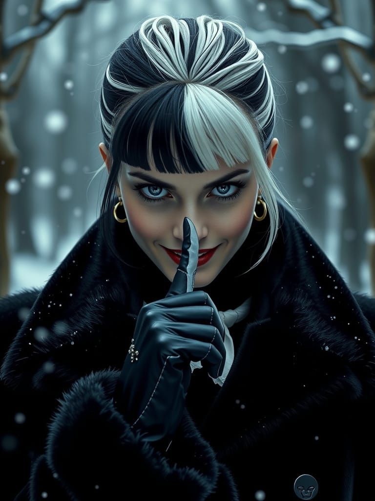 This image shows Cruella with her iconic black and white hair, wearing a black coat. She's smirking while staring intensely at the camera with a gloved finger to her lips. A serene winter forest is in the background, in a hyperrealistic cinematic style.