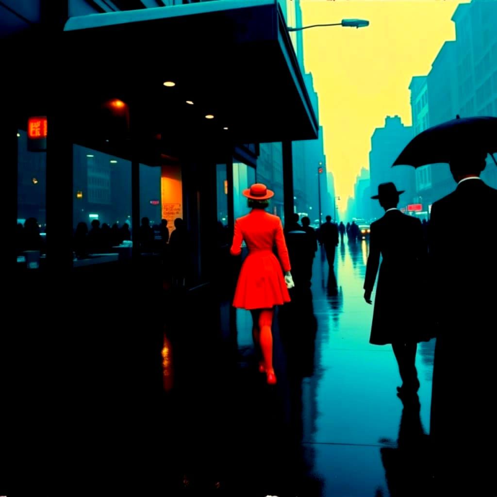 This image shows a vibrant and colorful city scene at night, reminiscent of 1950s New York, in a synthwave aesthetic. The artwork features soft focus and glitch art elements.