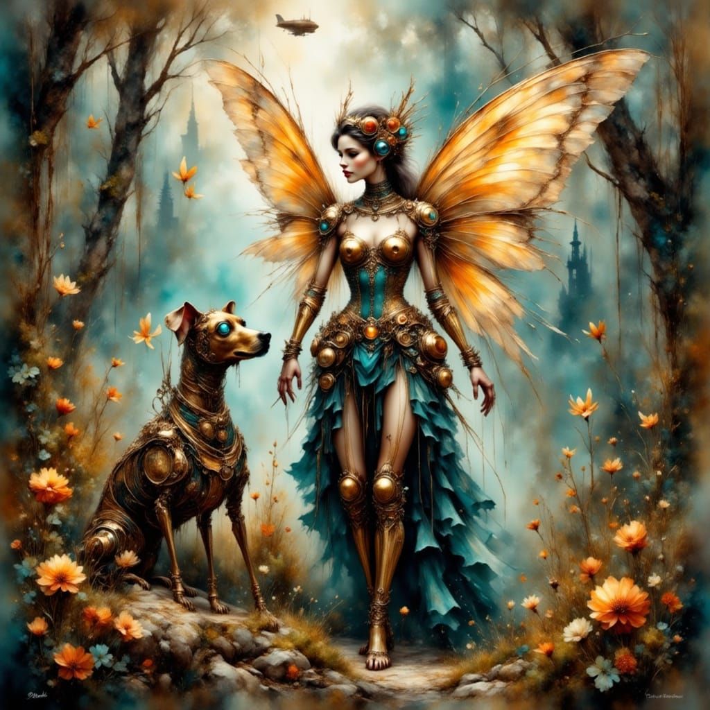 A striking picture of a steampunk fairy in a twilight industrial forest. This half-human, half-machine figure features intricate mechanical wings and a wind-up mechanical dog companion as 3D rendered digital art.